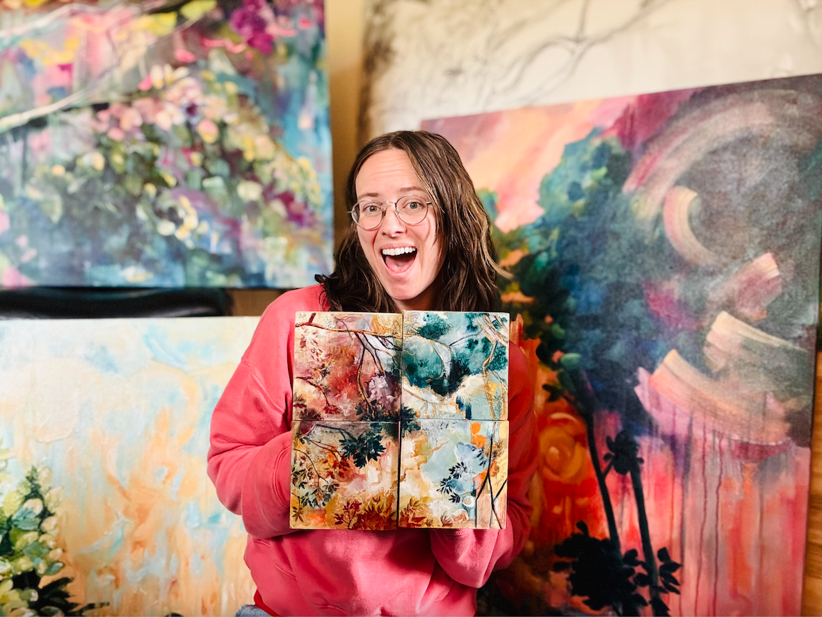 My approach is deeply collaborative and playful. My girls’ curiosity and resilience daily inspire me to let go of fear, embrace boldness, and create with wonder. The girls often lay down the first strokes, drips, or smears of paint, and I follow, bringing order and beauty one brush stroke at a time. It’s less about erasing what’s beneath and more about transforming it—layer by layer—into something whole, surprising, and alive. This process reminds me that the messiness of life can hold beauty if we are patient and willing to see it for what it can be.